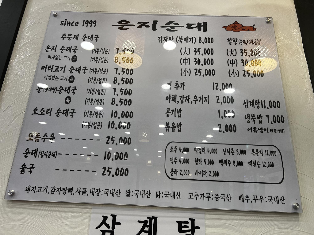 나는 머리고기 순대국 특(8,500원) 여자친구는 순(순대만) 순대국 기본(7,500원)으로 주문했다. 역시나 첫 주문 후 무슨 귀신이라도 홀렸는지 다른 메뉴가 보이는건 이번에도 마찬가지였다. 오소리 순대국이나 은지 순대국도 있었는데....ㅠ