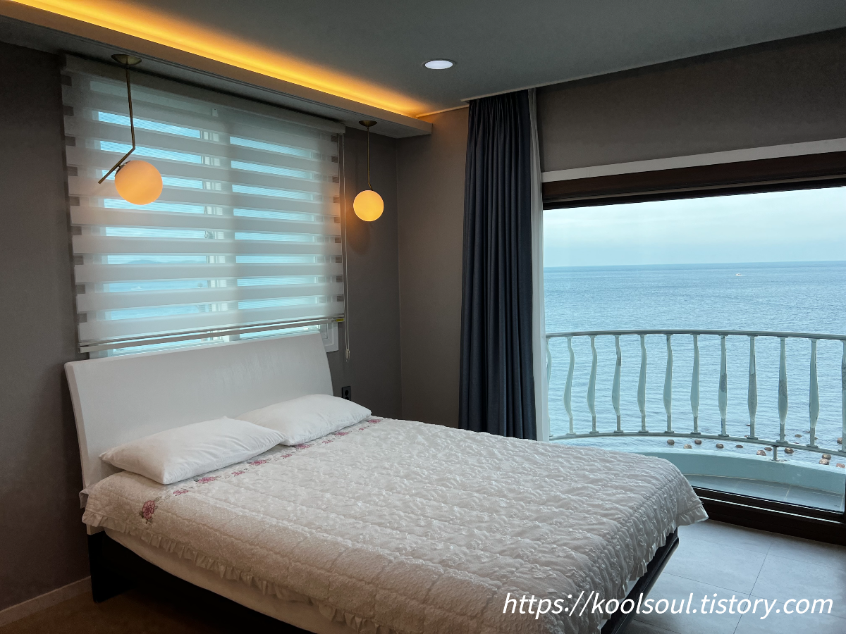 침대. 바로 바다가 보이는 성산 앞 바다가 보이는 바다뷰다.