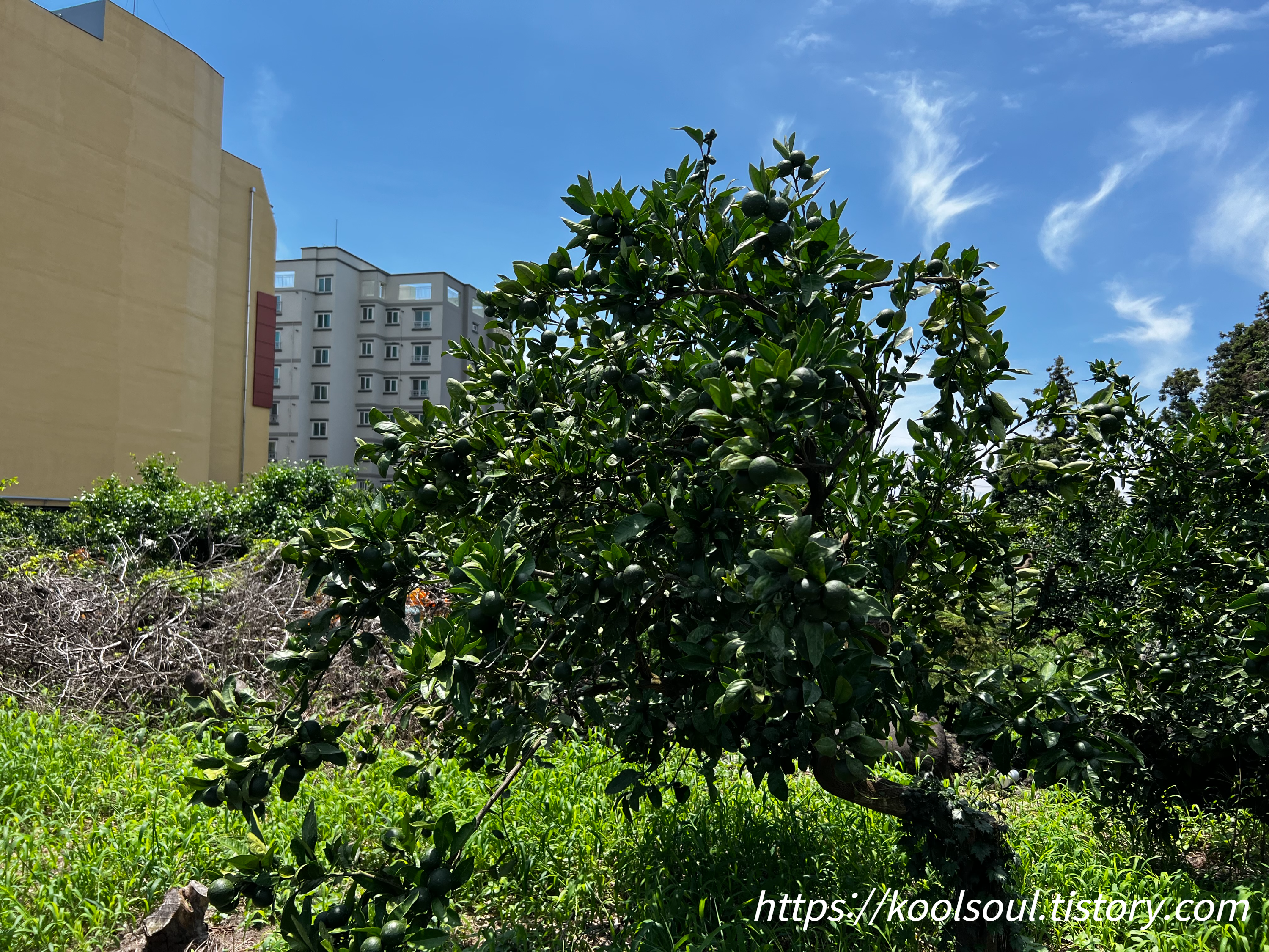 식당과 주차장까지 가는 길에 보이던 곳들. 감귤나무인가? 그리고 아주 옛날에 지어진 창고도 보인다. 뭔가 이런거 구경하며 가는 게 나쁘지 않았다. 서울에서는 보기 힘들 것들이니까.