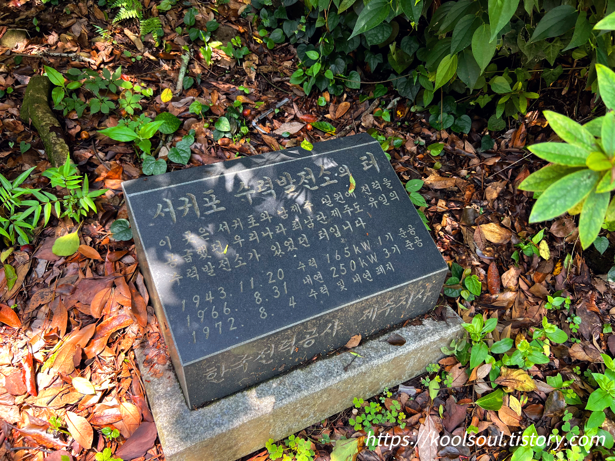 내려오던 길에 발견한 또 다른 신기한 기념석 발견. 천지연 폭포에 수력발전소가 있었다니... 신기해서 찍어 봄