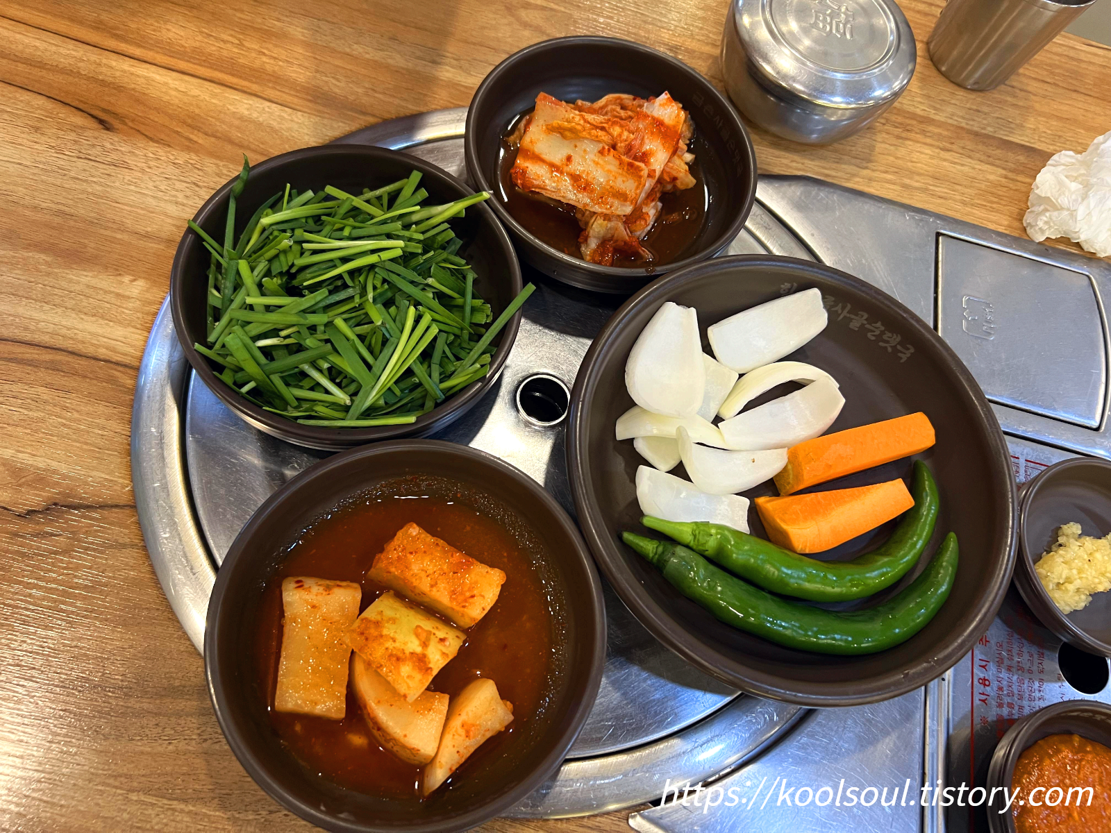 정식으로 나오는 두 종류의 순대. 순대가 정말 진짜! 너무 맛있었다. 돼지국밥처럼 부추가 저렇게 나오는 것도 좀 특이하다.