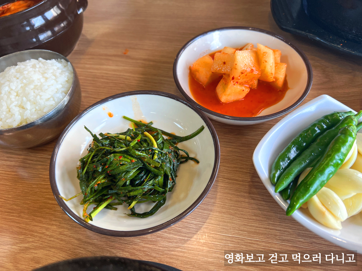 기본 반찬들. 청양고추와 마늘을 푸짐하게 주는 게 마음에 들었다. 또 저 부추절임은 생각보다 맛있는 별미였다.(김치, 깍두기, 부추절임 이렇게 작은 반찬통에 들어있어 덜어 먹을 수가 있다.)