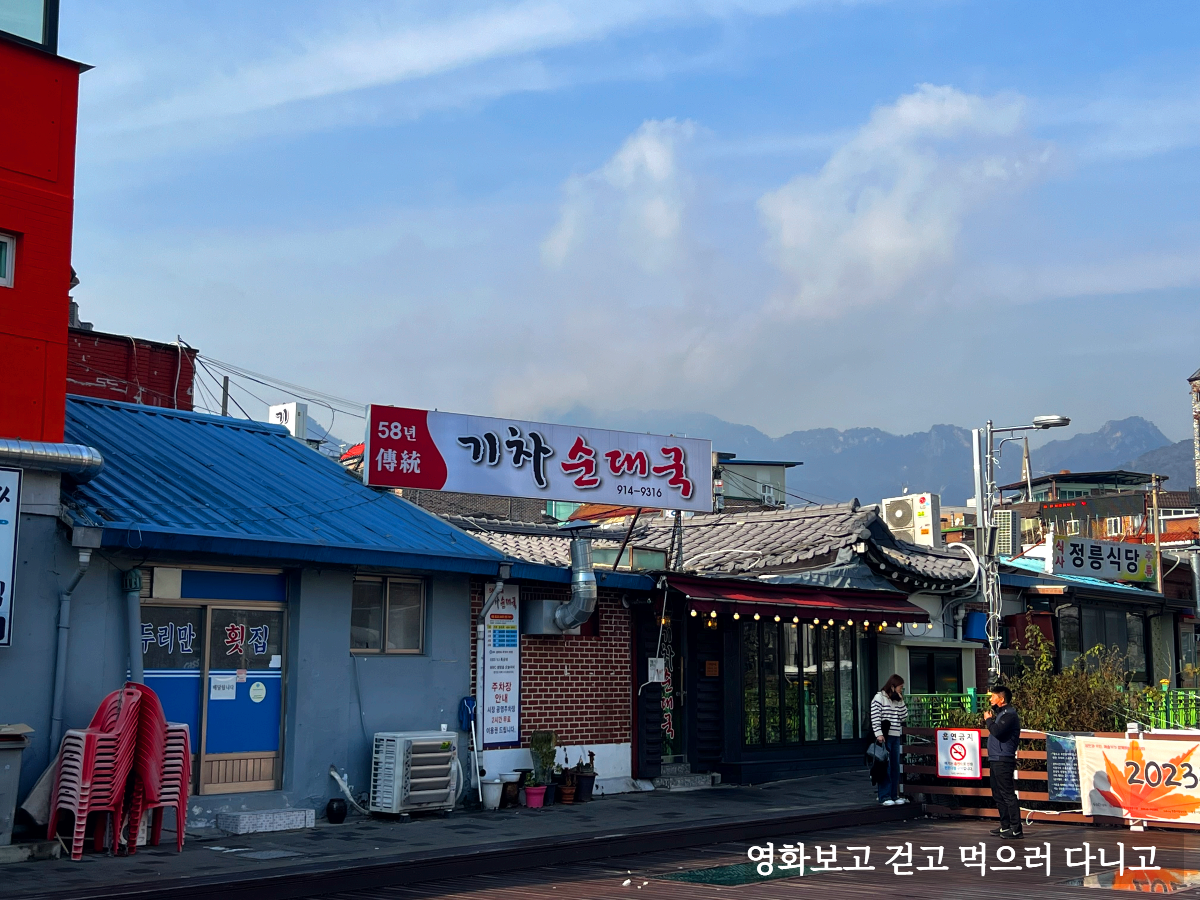 정릉천을 사이로 보이는 간판. 58년 전통 순대국집이라고 한다.