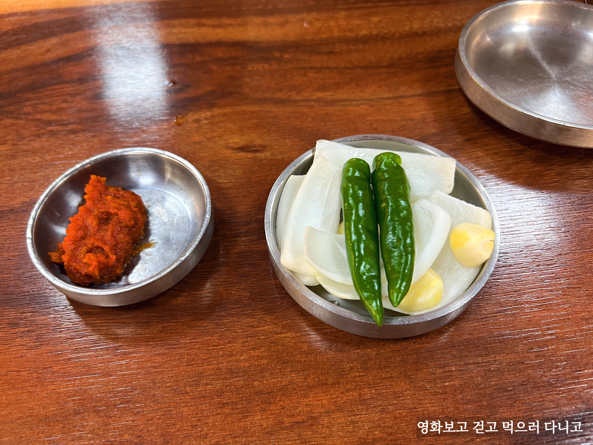 기본으로 나오는 청양고추, 양파, 편마늘이다.