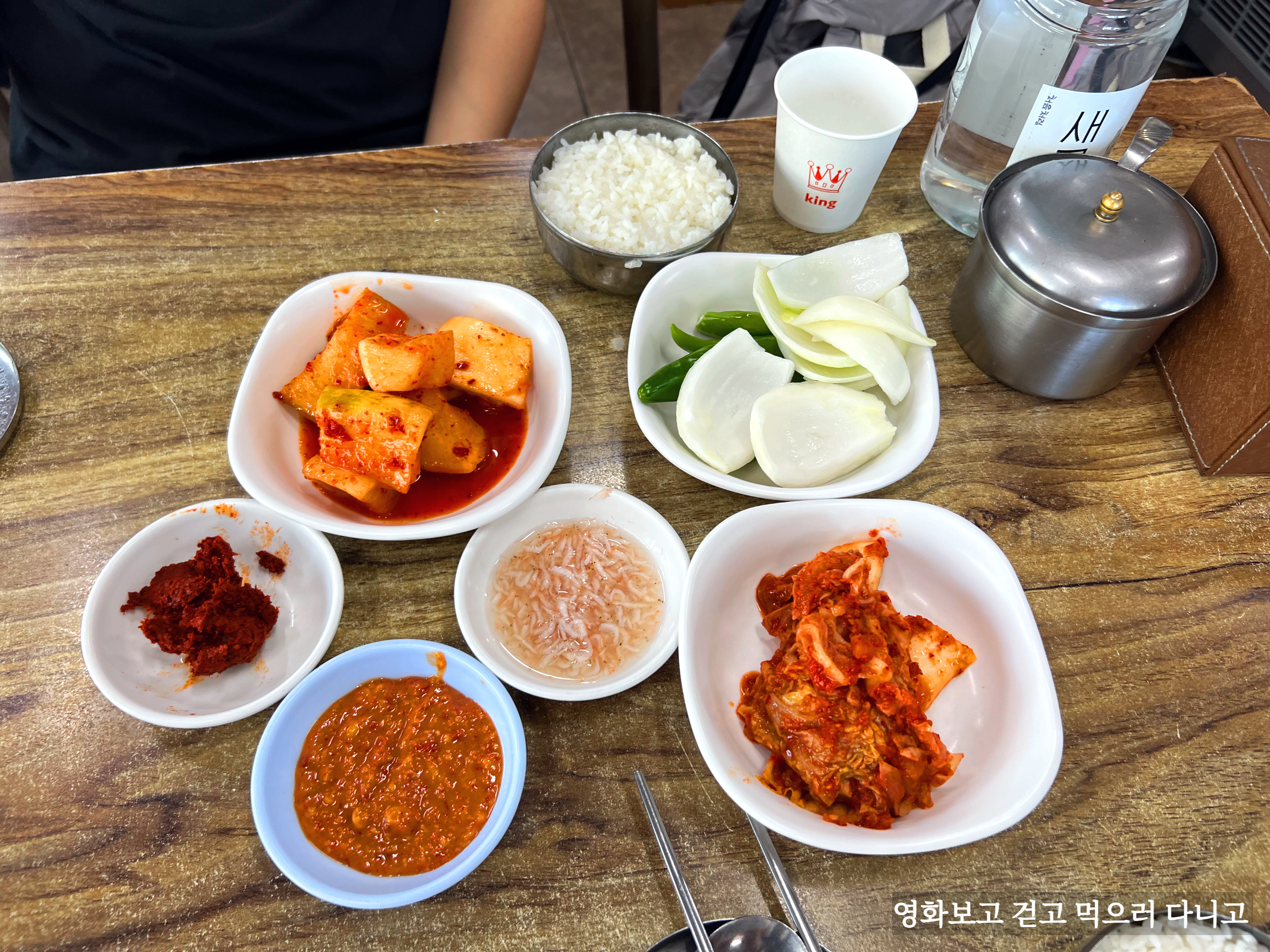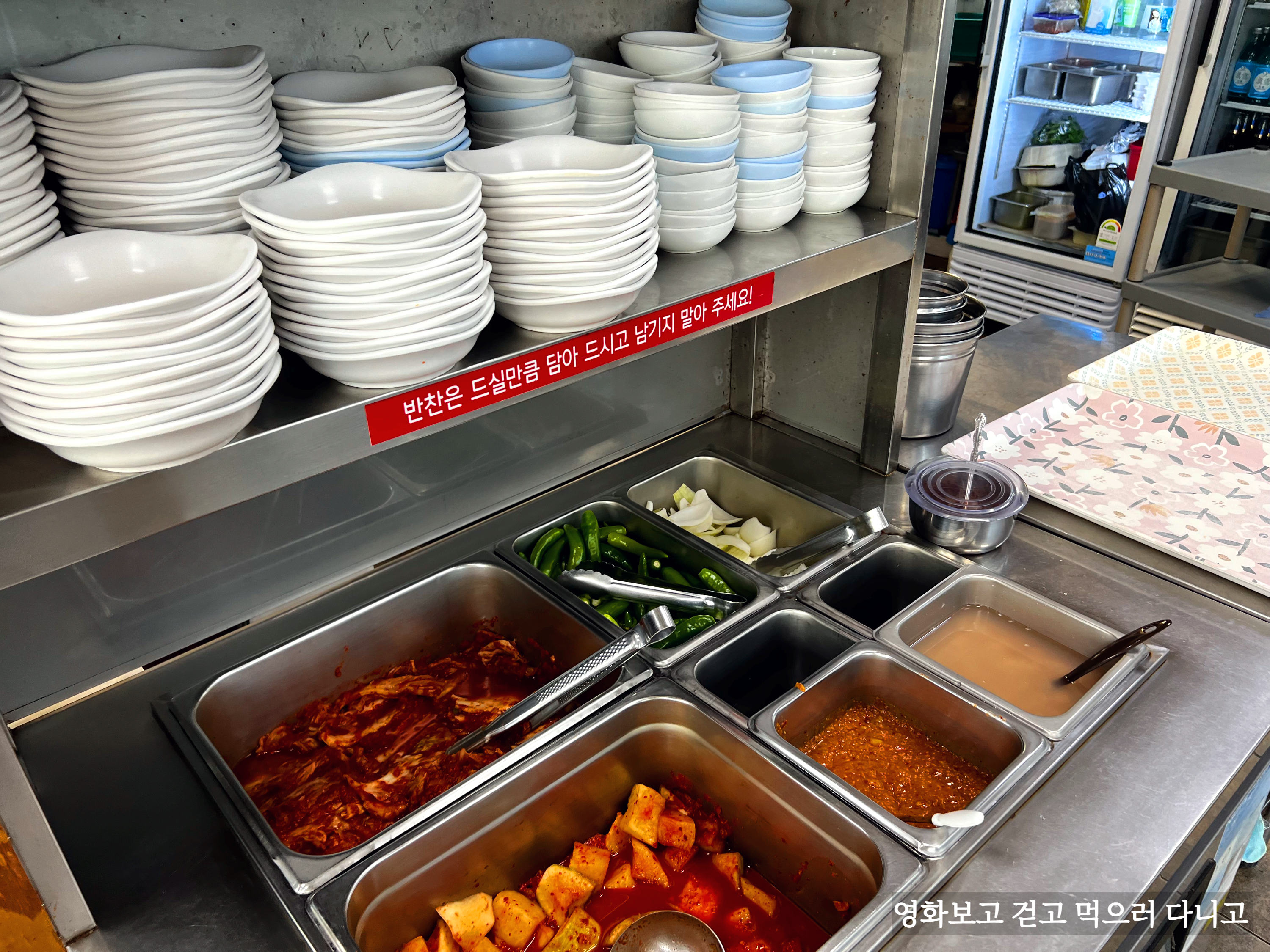 메뉴판 사진에도 있듯이 추가반찬은 셀프다. 김치와 깍두기 고추, 양파 등 많다.