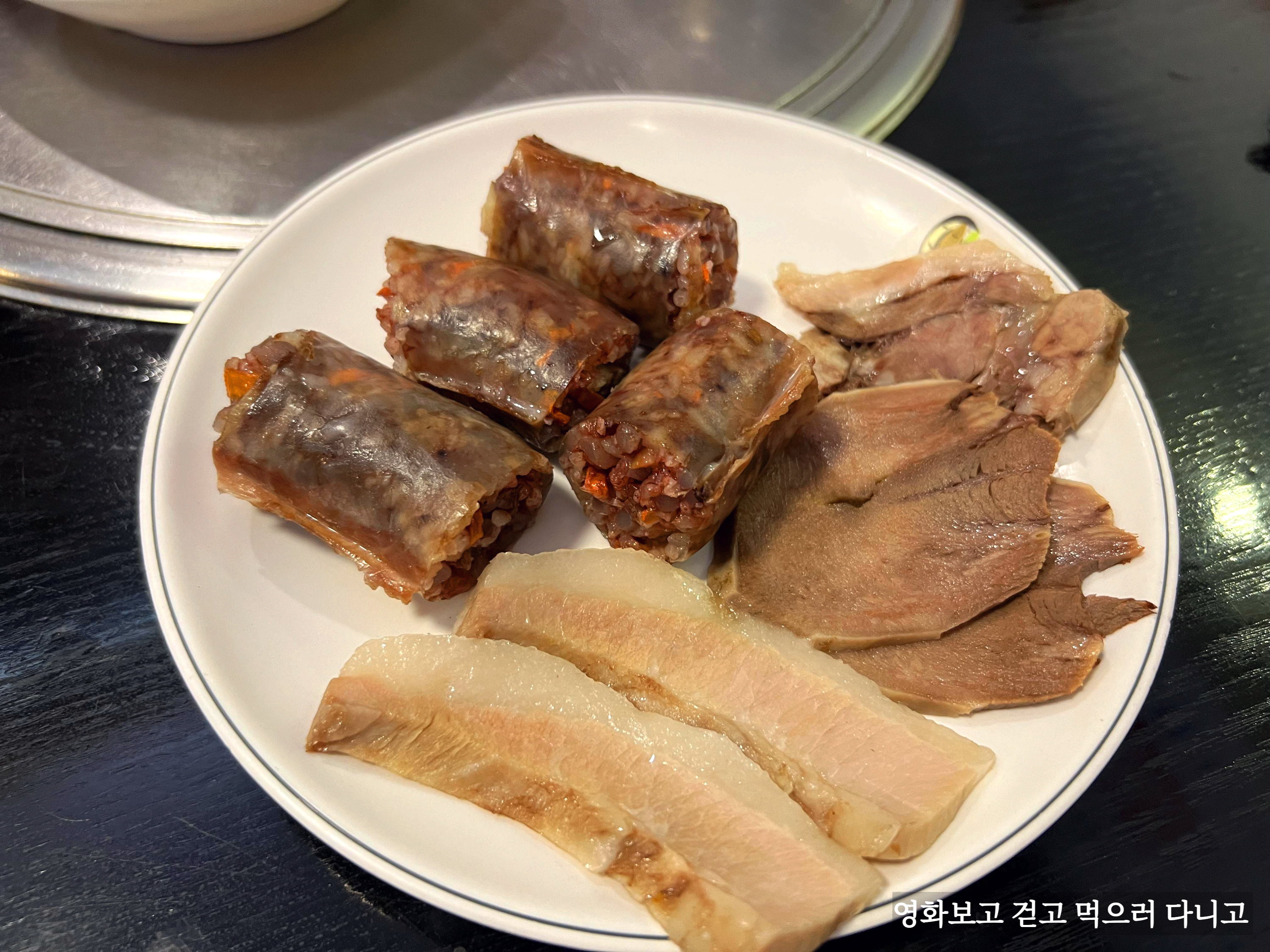 해늘정식으로 나오는 고기와 순대 참고로 찹쌀순대를 사용하는 곳인데 지금까지 먹었던 찹쌀 순대에 비해 찹쌀이 많이 들어가 있었다.
