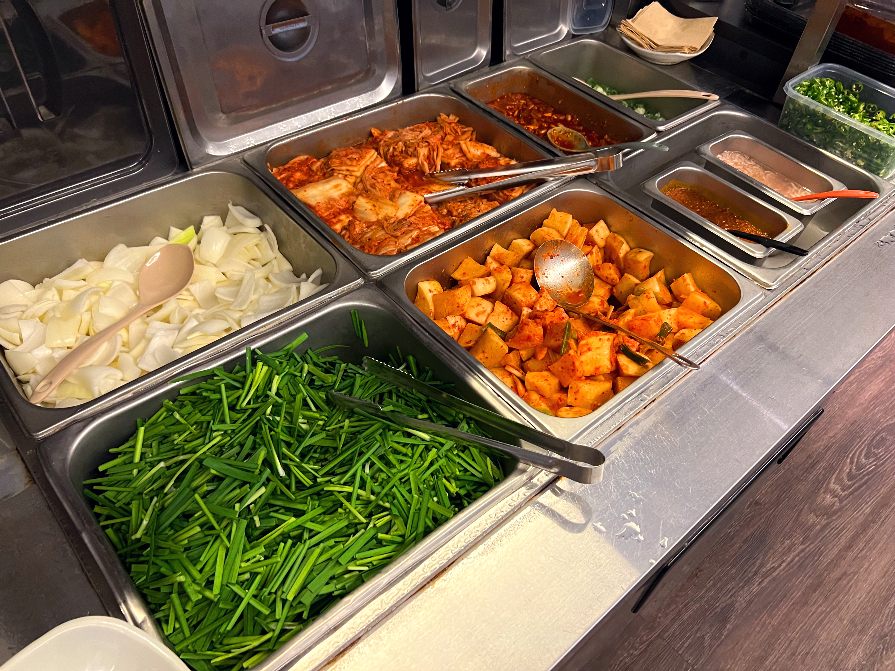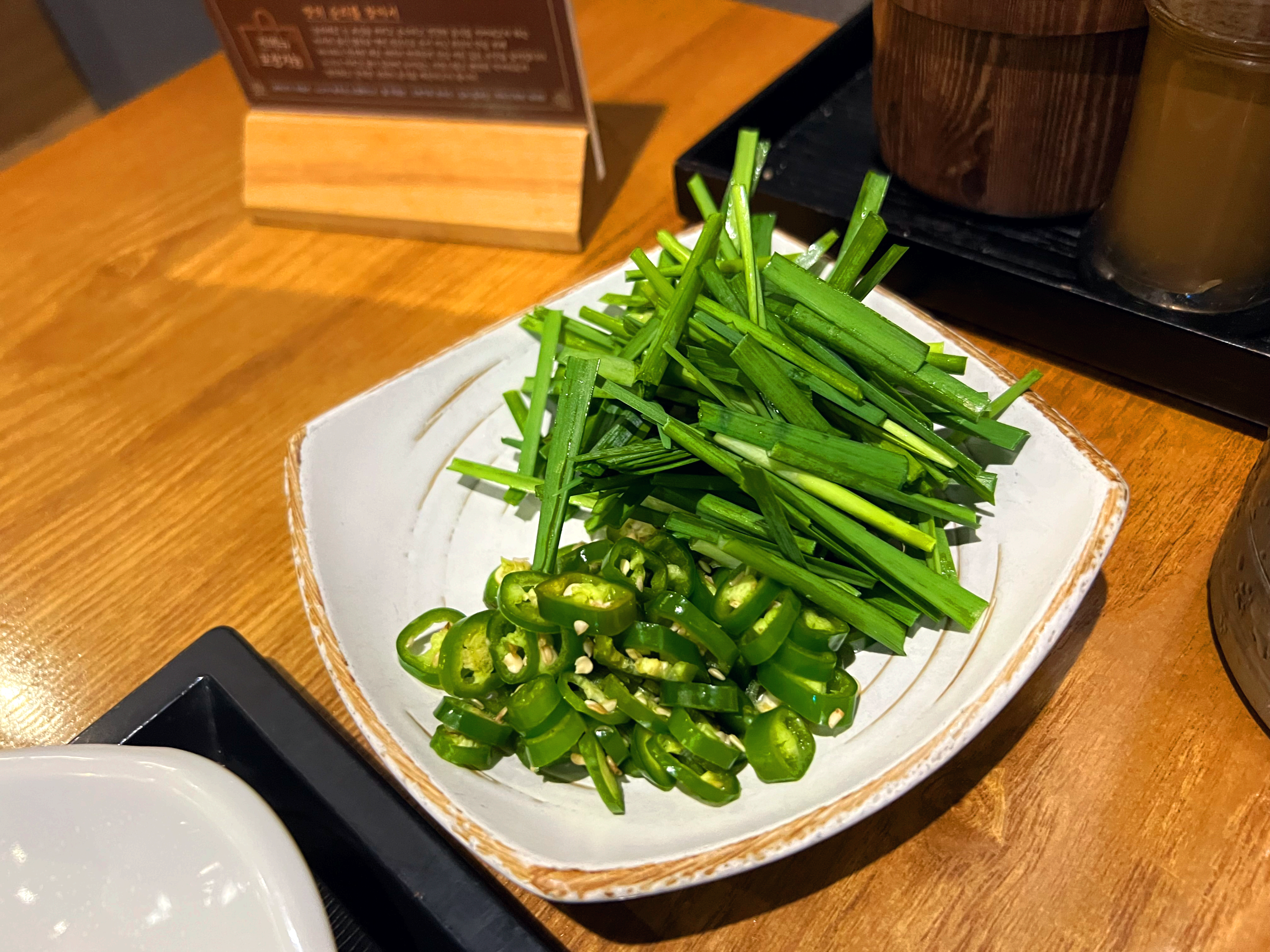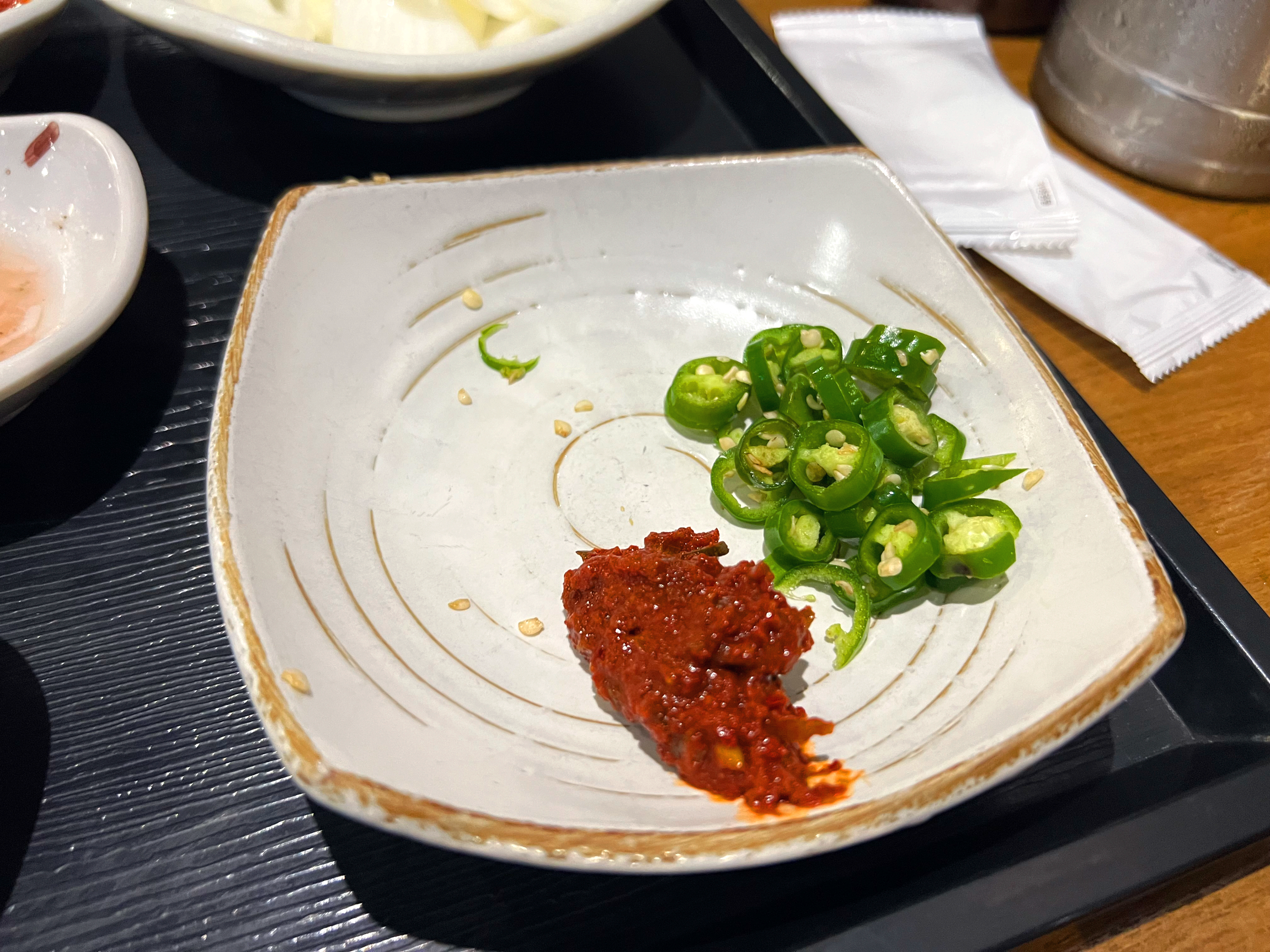 부추는 기본적으로 나오지만 부추를 좋아하기 때문에 추가로 더 가져왔고 마찬가지로 청양고추는 셀프바에서 가져왔다.(근데 하나도 안 매웠다.) 참고로 빨간국물은 시켰지만 그래도 다대기도 더 가져옴