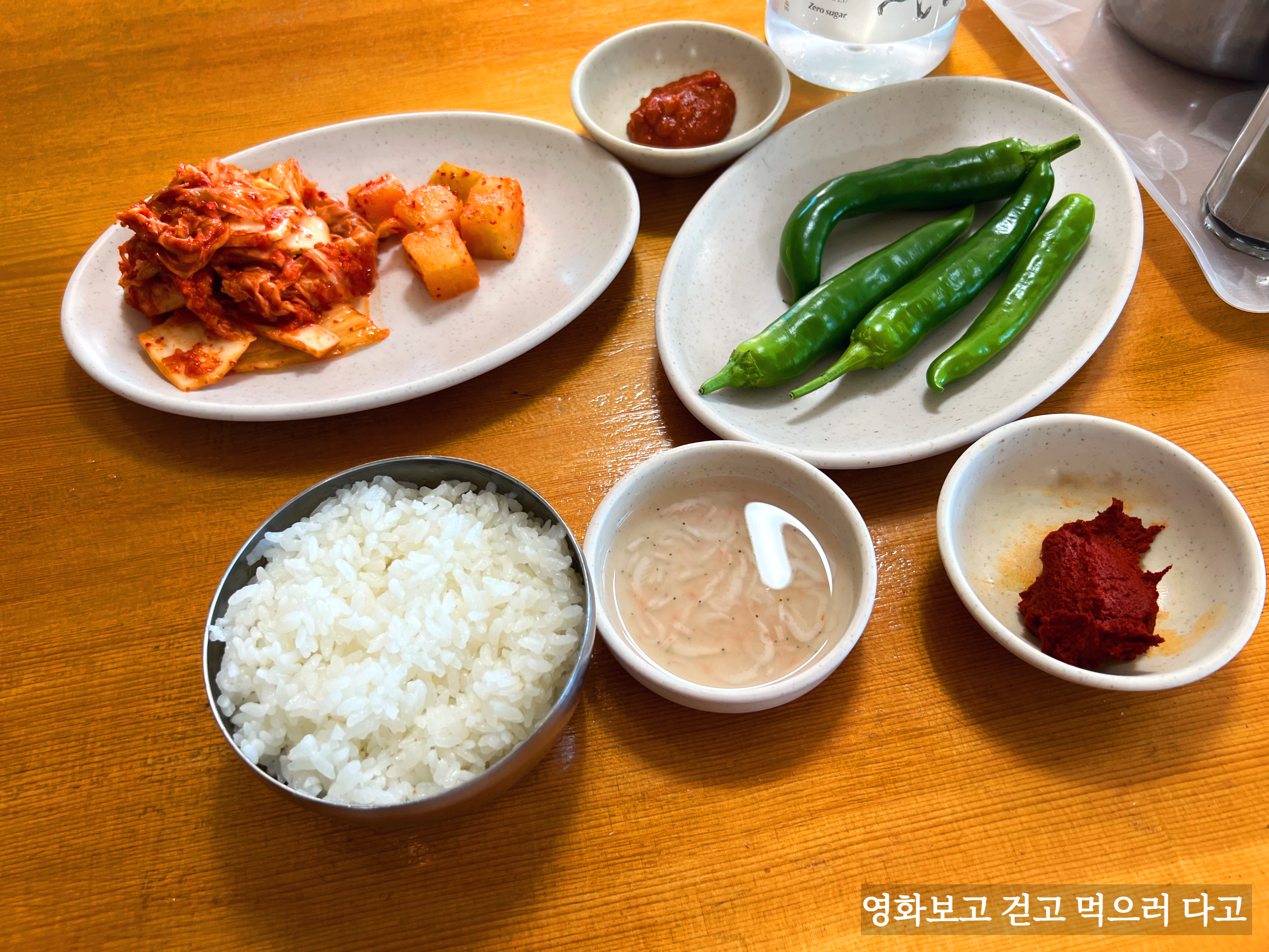 흰쌀밥과 풋고추, 김치와 깍두기(작은 항아리에 담겨져있는 김치와 깍두기를 접시에 덜어 넣은 것이다.) 새우젓, 쌈장, 다대기 이렇게 구성이 되어 있다.