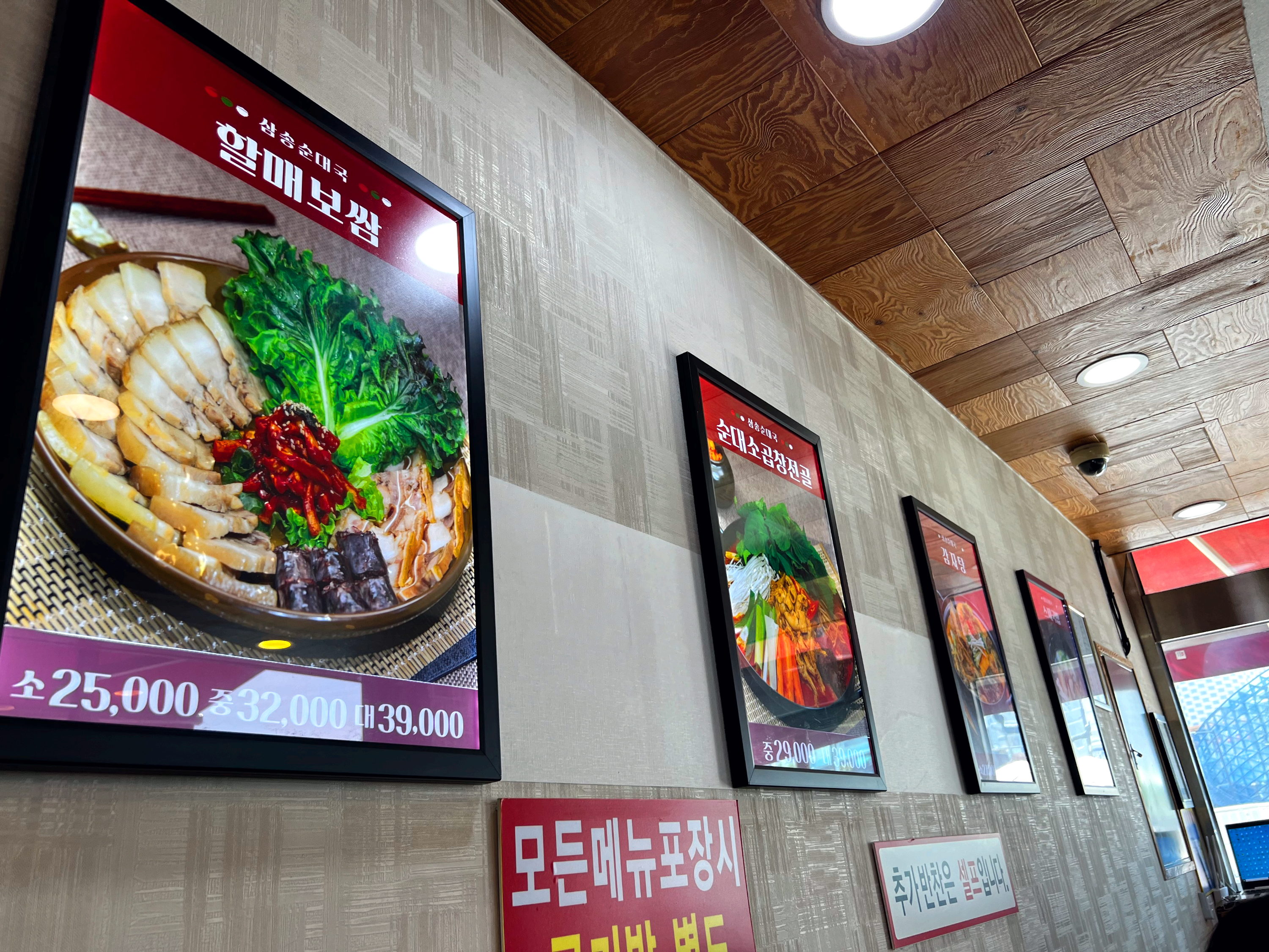 식당 안에서 볼 수 있는 메뉴판들과 음식 사진들.