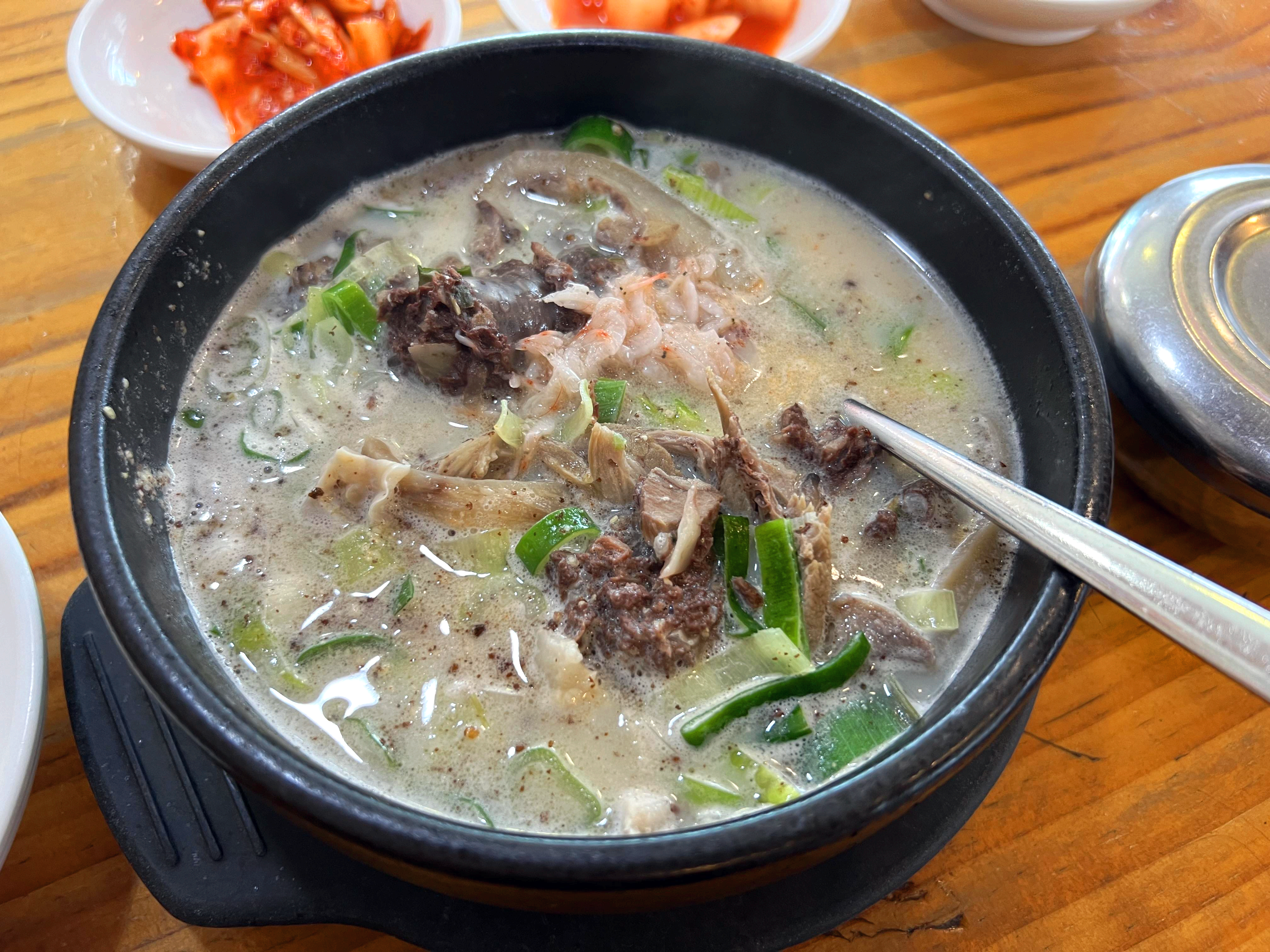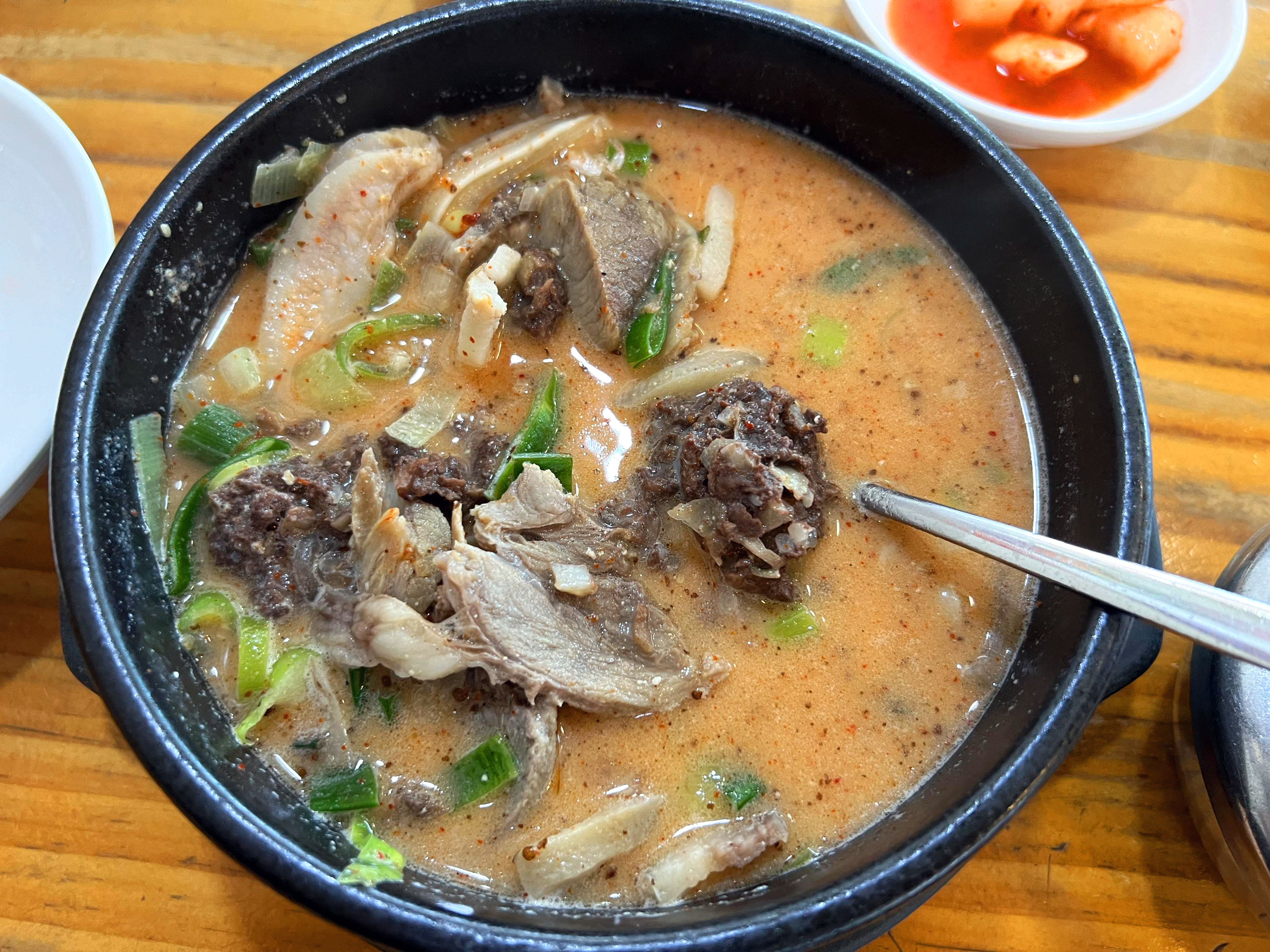 국물은 뽀얗고 걸죽해보이는 느낌이들지만 걸죽하지 않다. 일반 곰국 느낌의 국물.