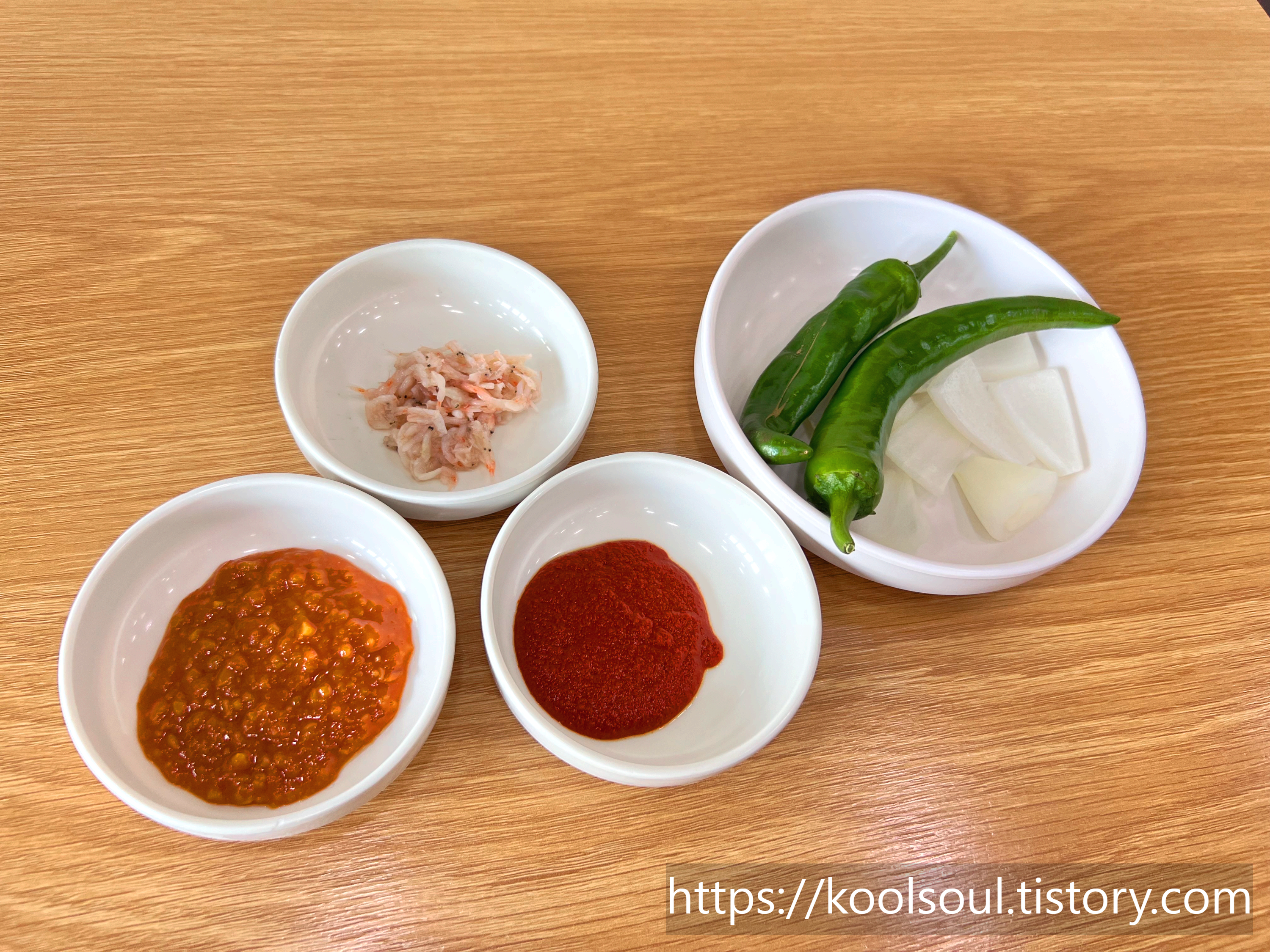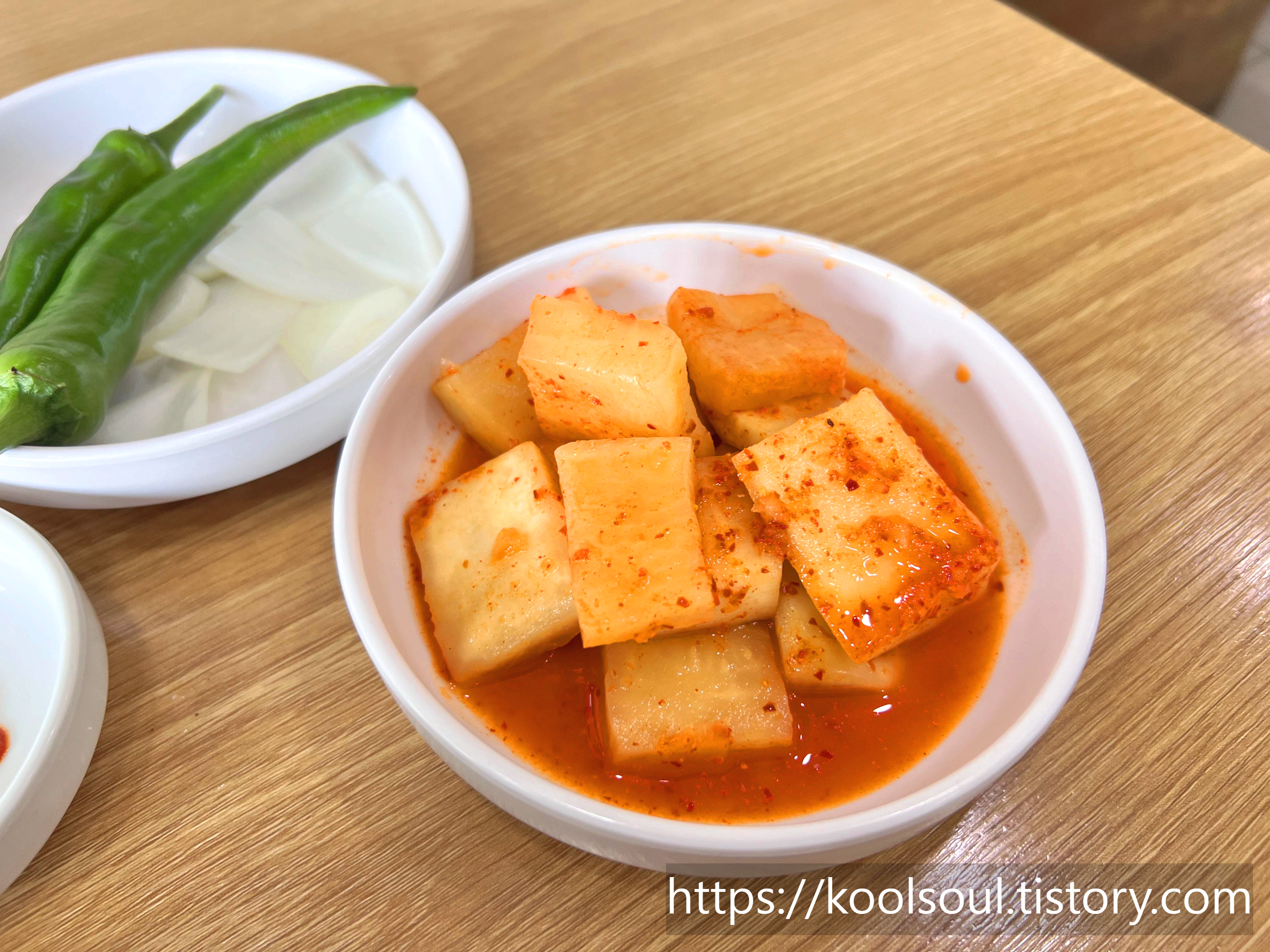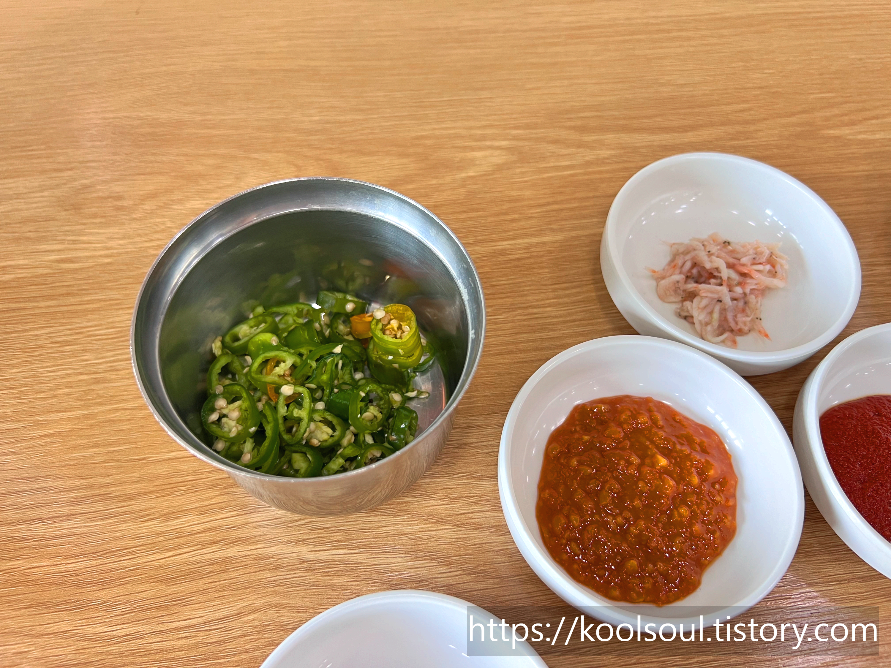 깍두기, 청양고추와 양파, 새우젓, 그리고 쌈장과 다대기, 썰어 놓은 청양고추 이렇게 셋팅된다.